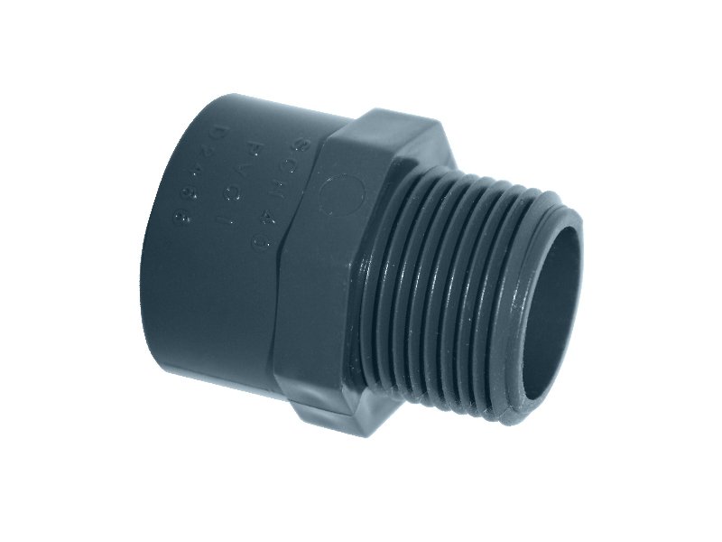 A Male Socket (PVC Pressure) is a PVC fitting designed to connect a PVC pipe to a female threaded fitting in a pressurized piping system. It features a male threaded end and a socket end for solvent cement connection with PVC pipes
